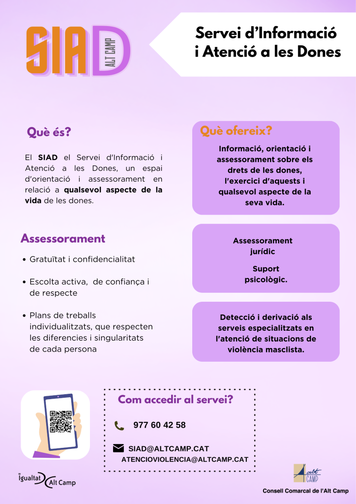 El SIAD és un servei públic, de titularitat comarcal, que té com a funció desplegar part de les polítiques locals d'Igualtat des d'una perspectiva de gènere, promoure i garantir els drets de les dones i atendre les diferents formes de violències masclistes, des d'una perspectiva interseccional.